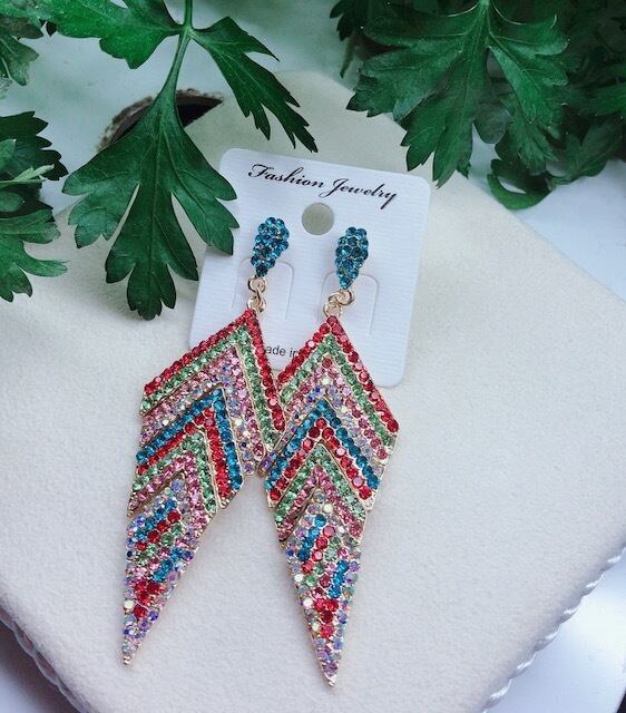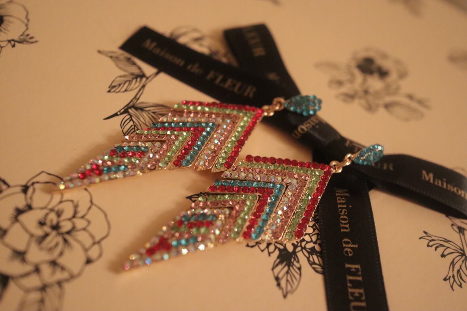 カラフルストーンだけで羽のようなモチーフを表現したビジューピアス