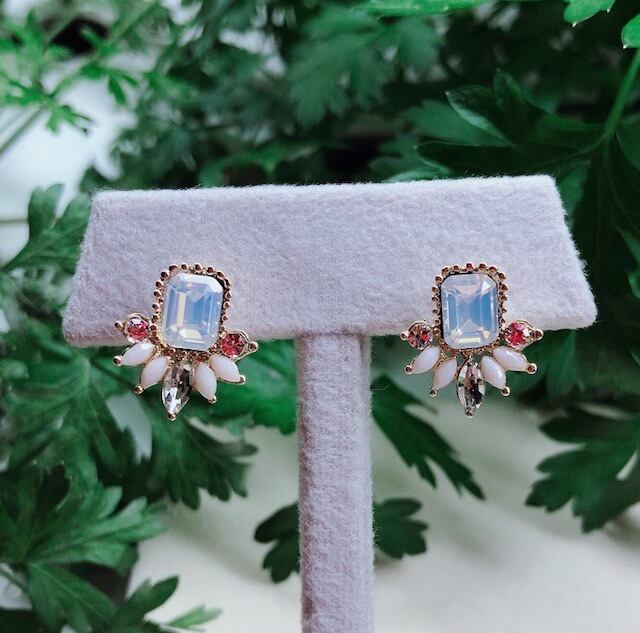 定番のスクエアカットの下に華やかにビジューをあしらったキラキラピアス。