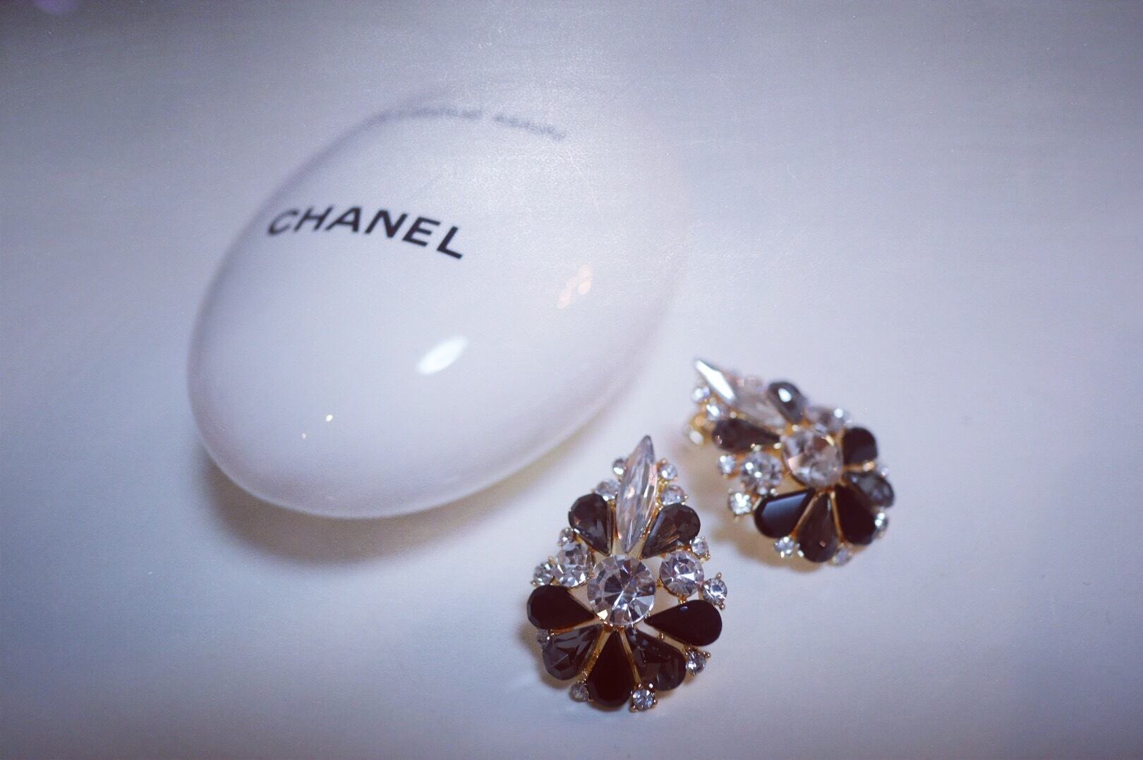 クリアとブラックのストーンのドロップモチーフピアス。